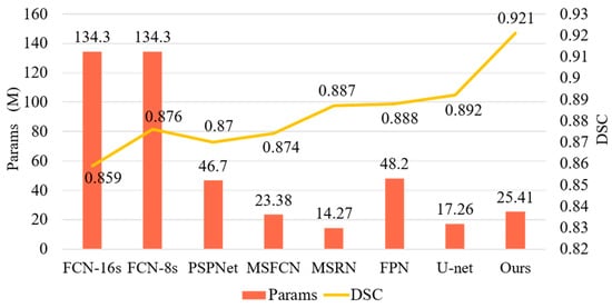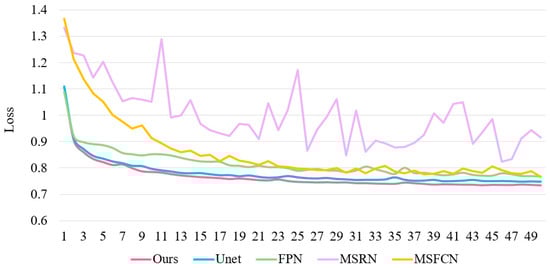 Figure 15 plots the graph of the loss function values for individual models in epochs based on the experimental data. In this experiment, we used L2 regularization for the loss function, set the weight decay to 50, and used data enhancement techniques such as image flipping and scaling to reduce the possibility of model overfitting. It can be observed that the loss values of individual models decreased numerically in general and eventually reached a smooth lower loss value, which indicates that the NFSR-U-Net and the other models underwent normal convergence. The initial loss values of the loss functions of MSRN and MSFCN are relatively large because the initial parameters of the models are set separately, and the initial loss values might also differ. In addition, the MSRN model has more dramatic fluctuations in the loss values compared to the other models, which may be a result of differences in the generalization ability, complexity, learning rate, or probability problems of individual models, leading to the models falling into local optima.