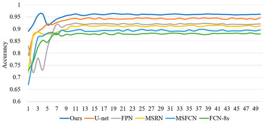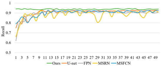 Figure 12 shows how the image segmentation accuracy of each model changes as the number of training rounds increases. A total of 800 training epochs were completed, and 50 epochs (randomly select 1 epoch out of every 16 epochs) were randomly selected for the comparative analysis of the segmentation accuracy values of different models. From the line graph, it is observed that after training nearly 160 epochs, the training effect of each segmentation model reaches a more stable state, in which the segmentation accuracy value of NFSR-U-Net is close to 96%, higher than that of FPN, MSRN, and other models, and its accuracy value is very stable. The accuracy ranking of each segmentation model is: NFSR-U-Net (ours) > U-Net > FPN > MSRN > MSFCN > FCN-8s > PSPNet.