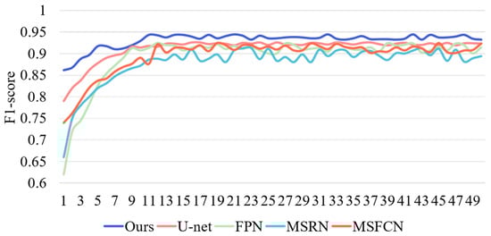 Additionally, recall is also a very important evaluation index when evaluating the image segmentation effect, which reflects the possibility of the occurrence of missed diagnoses. Figure 13 shows the variation in recall for each model. It can be seen that the recall values of U-Net, FPN, and MSFCN change sharply in the early training period but stabilize in the late training period, while the recall of the MSRN model fluctuates throughout the whole process. In contrast, the Recall of NFSR-U-Net has less fluctuation and higher values after stabilization, which reflects that it is capable of effectively circumventing the occurrence of missed diagnoses and has better performance. Then, we compared the F1-score of NFSR-U-Net with other partial models. Figure 14 displays the variation of the F1-score for each model. It is observed that the F1-score of the NFSR-U-Net always maintains a high value, and the final value remains stable, which indicates that the NFSR-U-Net is very effective for osteosarcoma MRI image segmentation and has high robustness.