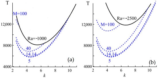The boundaries of the marginal instability for monotonic (solid black lines) and oscillatory (dashed blue lines) disturbances at different mobility parameters M and Rayleigh number values. (a) Ra = −1000; (b) Ra = −2500; = 0.224, Pr = 10.