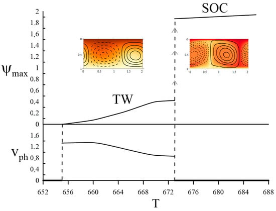 With further increase in the electric Rayleigh number (T > 671, Figure 5), the intensity of electro-thermo-convection sharply grows, and the regime of stationary overturning convection is formed (Figure 5, the transition is marked with an up arrow SOC). This regime is characterized by mirror symmetry between rolls that rotate in opposite directions (Figure 5, right insert). The maximal value of the stream function = 2 is much greater than in the traveling wave mode. The phase velocity of the traveling wave decreases monotonically with increasing electric Rayleigh number.