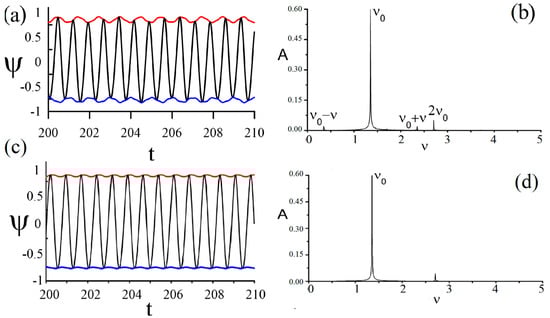 If the modulation amplitude does not exceed a certain critical value in general, the oscillations of the stream function have two different frequencies, and these dynamics correspond to modulated traveling waves (MTW). The evolution of the flow versus time and the Fourier spectrum of the are shown in Figure 7 for = 0.224, T = 6950. The Fourier spectrum (Figure 7b) contains a few frequencies which are the combination of the fundamental frequency of the traveling wave in the unmodulated case and the modulation frequency . The largest peak corresponds to , and the height of the peaks at in the spectrum is smaller. If the external frequency coincides with the fundamental oscillation frequency , the spectrum looks simpler (Figure 7d). It contains only multiples of frequencies; we have periodic TW.