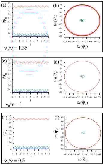 The modulation of the field causes a change in the amplitude of the spatial harmonics (Figure 8). The behavior of harmonics is different for different frequency ratios . In the most common case, the characteristic frequencies and of the MTW solution is not rationally related to each other. The oscillations of the first harmonic amplitude (red line Figure 8a) is an example of such a quasiperiodic TW with 0.74074. Thus, the trajectory of (Figure 8b) is not closed, and orbits fill the area between = 0.83 and = 0.77. In Figure 8d–f, we show the trajectories for periodic TWs with Q = 1 and 2, respectively. Here, the orbits of are closed after one and two periods of , respectively. The contribution of the second harmonic = 0.098 does not exceed 13% of the contribution from the first harmonic. The contribution of the third harmonic is small, = 0.04. The behavior of the third harmonic (blue line in Figure 8) corresponds to a standing wave. The contribution of higher harmonics is even smaller: