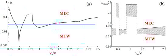 The dependence on the critical value of the amplitude () on frequency is the boundary between the modulated traveling wave (MTW) and the modulated electroconvection (MEC). Such dependence (𝜈) at = 0.224, T = 6950 is shown in Figure 10a. Below this curve, the MTW regime is stable; above this boundary, modulated electroconvection (MEC) is stable. The dependence is not monotonic; it has local minima and maxima. The frequencies of the minima have specific values which correspond to the ratio /𝜈 = 𝑛/2, 𝑛 = 1, 2, 4. This confirms the presence of parametric resonance in the system. The absolute minimum at the boundary of parametric instability of the MTW is clearly manifested (the first resonance tongue). It corresponds to the external frequency that is twice the fundamental one (𝜈 = 2, 𝑛 = 1). Due to the presence of dissipation in the convective system, the remaining minima (resonance tongues) are not so sharp and are located much higher in amplitude.