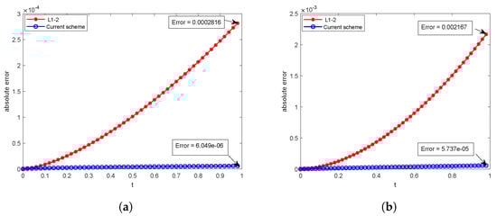 Figure 1a,b show that the comparison of absolute error for the scheme defined in [] and the current scheme (18) for and , respectively.