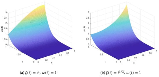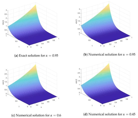 In Table 10, we validate the proposed scheme with [] (Example 5.1). Firstly, we present the max error, the convergence order with fixed and varying N with 8, 16, 32, 64, 128 for . It is noted that the convergence order of our scheme (37) for the temporal direction is almost the same as []. After that, we express maximum error and convergence rate for the spatial dimension to set and changing for the same value of ; we observe that the spatial convergence order of our numerical scheme is same as []. Thus, the scheme presented in [] becomes a particular case of the proposed scheme (37) for and . Furthermore, we can compute numerical results for different suitable choices of scale and weight functions.