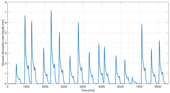where is the maximum input rate that the insulin pump can handle. The value of was chosen to be , which corresponds to the typical maximum basal administration rate in commercial insulin pumps [27].