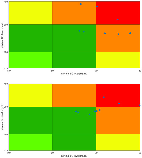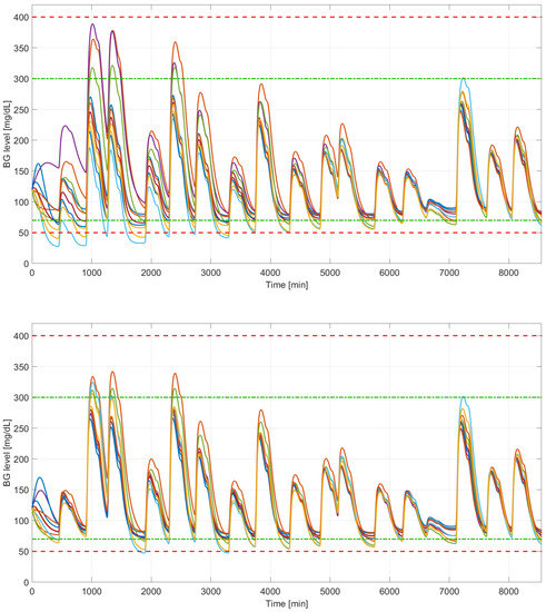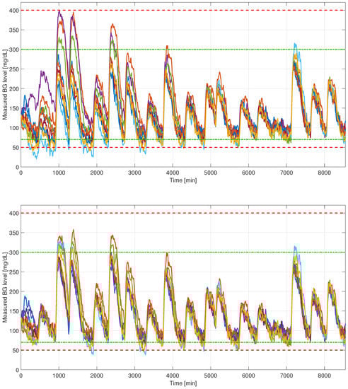 The first simulation with the initially tuned parameters led to unsatisfactory results in general. Of the ten virtual patients, only eight could stay within limits on the BG level. Additionally, three of the remaining cases were grouped in the E region of the CVGA plot, indicating life-threatening BG levels. Consequently, the control parameters were fine-tuned, so better performance was achieved. Through simulations the control parameters were empirically modified to , , and . By decreasing the eigenvalues of , the response time of the linear controller can be decreased, thus lowering the overshoot in the BG level due to the disturbances. This modification improved general performance; however, two virtual patients were still out of range. The simulation results can be seen in Figure 3, Figure 4, Figure 5 and Figure 6, and the corresponding CVGA plot in Figure 7. Table 3 contains each patient’s CVGA and TIR metrics, where an additional column shows the extreme cases where hypoglycemia or hyperglycemia occurred. The best results were achieved in the case of , and , where the TIR was in the safe range (70–180 (mg/dL)) for more than 80 % of the time. However, as one can see, only two sets of parameters entered the safe region B on the CVGA plot, while the others remained in the D and E zones. While this seems to be a poor result at first glance, another perspective can be gained by inspecting Figure 3.