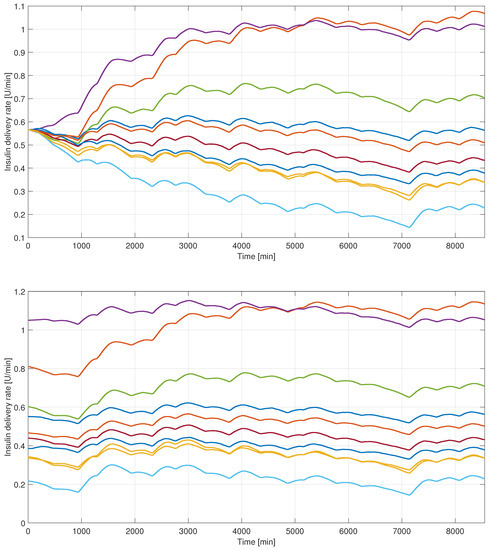 The computed closed-loop insulin delivery rates. The top figure shows the slow adaptation case, while the bottom corresponds to the fast. The signals closely resemble the deformed signals. One can see that the input signals in both cases respected the actuator limitations, hence the control strategies were feasible in practice.
