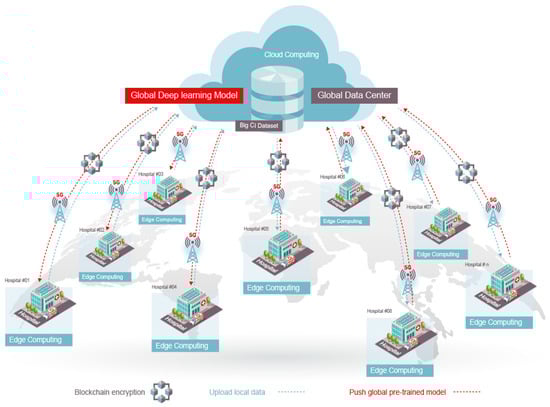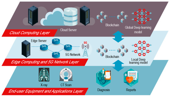 The utilization of 5G allows healthcare professionals to collect and access patient data remotely with enhanced efficiency [5,6]. AI technology, such as deep learning (DL), enables the extraction of higher-level features from raw input, such as CT or chest X-ray (CXR) scan images, through a training dataset available at edge devices [7]. The training process of DL can be distributed by combining the power of 5G with the unique DL architecture at the edges. Finally, blockchain technology allows for the safe storage of information and data from malicious or accidental theft, loss, or modification. Therefore, a combination of 5G, DL, and blockchain can provide a secure and efficient health data analysis and diagnosis system.