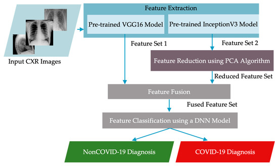 The proposed framework employs a feature-level fusion deep learning approach that uses the VGG-16 and InceptionV3 pre-trained models to extract two different sets of features from CXR images of COVID-19 patients. PCA is used to reduce the high dimensionality of InceptionV3 features while maintaining essential features. The feature sets are fused into a new feature vector and subsequently used for classification with a DNN model. Experimental results on the public dataset of COVID-19 CXR images demonstrated that the proposed DL approach can effectively exploit the fusion of multiple features and improve recent related work.