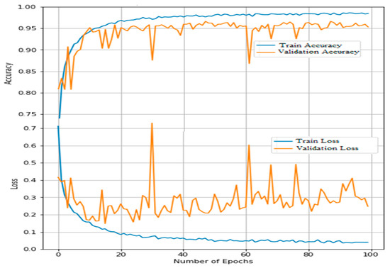 After training the DNN model on fused extracted features from the training and validation sets, it was then evaluated using a test set. The accuracy and loss results of the training and validation sets at different epoch numbers, as well as the confusion matrix of the test set, are shown in Figure 4.