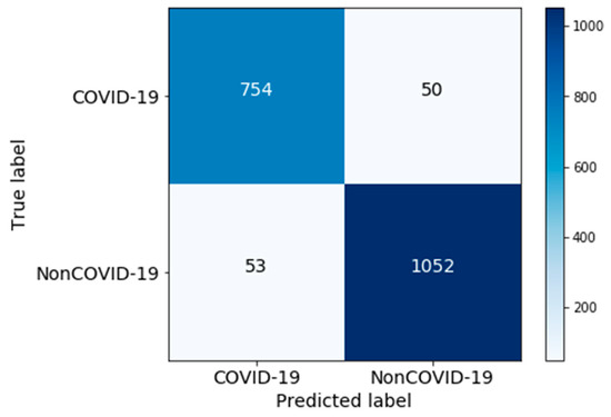 The DNN model’s training and validation accuracies were stable after 50 epochs, with saturation points of 98.4% and 96.6%, respectively, as seen in Figure 4. This guided us to stop training at epoch 40. The confusion matrix in Figure 5 shows that the DNN model classified 754 COVID-19 cases out of 804 and 1052 non-COVID-19 cases out of 1105, achieving an overall accuracy of 94.6% on the test dataset. Table 1 lists the model’s precision, recall, and F1-score, which all had a weighted average of 94.6%. These results demonstrate the impressive performance of our framework and its potential to be used by medical professionals.