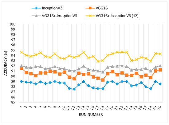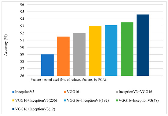 To identify the advantage of feature-level fusion, we applied PCA to many features extracted using well-known DL methods, namely Inception V3, VGG16, and fusion of the features obtained from a combination of Inception V3 and VGG16, as described in Section 3. Figure 6 exhibits the accuracy results of the feature method used and the number of reduced features using PCA. It is evident that the feature-level fusion of VGG16 with reducing features of InceptionV3 to 12 components reached the highest accuracy score (95% approx.).