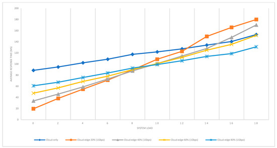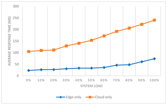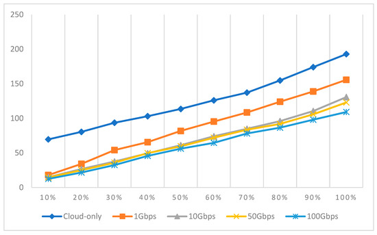Figure 8 depicts the typical response times for edge-only and cloud-only systems with different loads and no limits on edge–cloud bandwidths. No restrictions on bandwidth caused the predominance of queuing delays. When the system loaded for edge-only arrangement achieved 60%, the response time passed the 50-ms threshold. Our simulation showed that if the core cloud has unlimited capacity, the latency of the network influences the overall response time of the application.