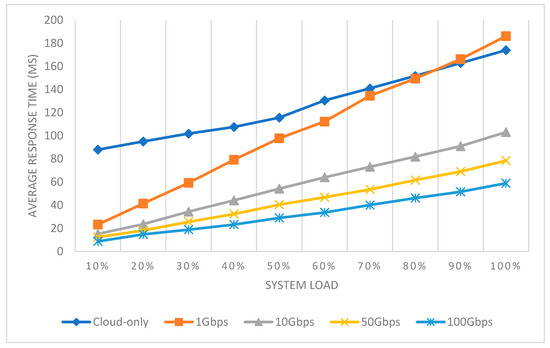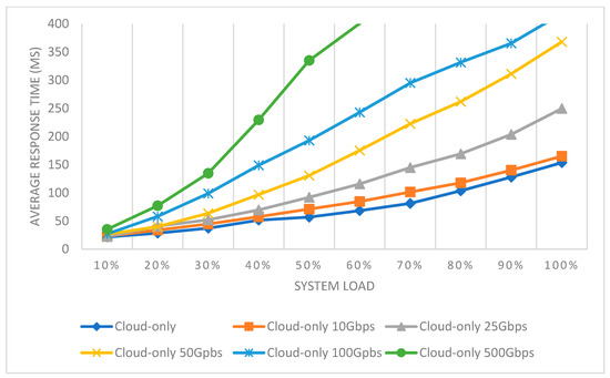 Figure 10 outlines the average time of response for the central cloud and edge-only schemes with various edge bandwidths. While the 100 Gbps front-haul bandwidth can be compared to the unlimited bandwidth edge-only system, which means that each of the resources on the edge is employed, once the system is considerably full (load = 70%), the core-only system starts outperforming the edge-only arrangement with 1 Gbps of edge bandwidth.