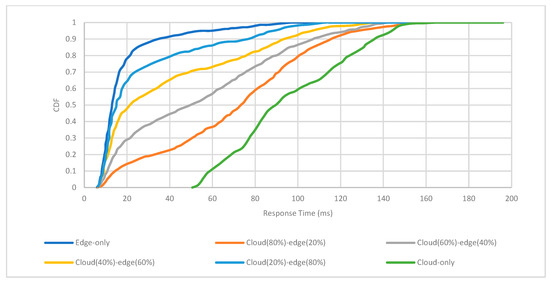 Once the load point was reached, we observed any significant decrease in average response time regardless of the edge front haul connectivity’s quality. This scenario included a crossover of load = 70%, which is why, in Figure 11, we compared the CDF of edge-only and center-only systems with the 1 Gbps outline. In a static load outline, it was possible to observe a linearly rising response time. This implies that an edge bandwidth of 1 Gbps is unsuitable for operating a massively loaded system.