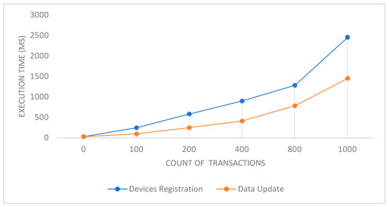 The time it takes for sealers to group and validate non-verified transactions from the transaction pool to create a new block is known as execution time. We examined how execution time changes with the number of transactions during two processes: device registration and IoT data update. As shown in Figure 13, an increase in the number of simultaneous transactions leads to an increase in execution time for updating data. Similarly, Figure 14 illustrates that the device registration process takes twice as long as the data update process.