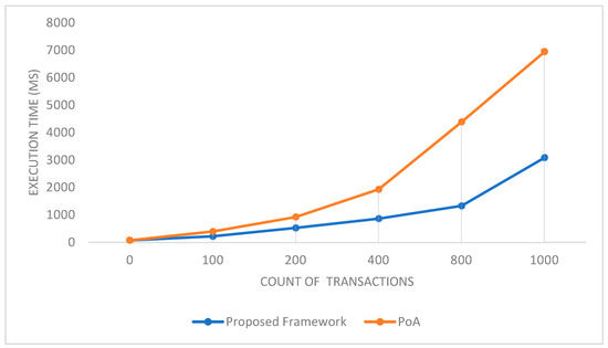 Figure 15 compares the execution time of the proposed framework and PoA. In a hospital setting, ten IoT devices generate ten simultaneous transactions, and ten nodes send 100 transactions concurrently to the network. Our framework had an execution time of 227 ms for 100 transactions in ten hospitals with ten IoT devices and 533 ms for 200 transactions in twenty hospitals. When the number of transactions was doubled to 1000 transactions made by four hundred hospitals, the execution time only increased slightly to 3090 ms. Notably, this was almost 50% faster than PoA.