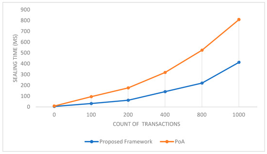 The time between a block’s validation and chaining is known as sealing time. Figure 16 compares the sealing time of the proposed framework with PoA as the number of hospitals increases. Our framework recorded a sealing time of 32 ms for 100 transactions in four hospitals and only 413 ms for 1000 transactions. In contrast, PoA recorded a sealing time of almost 810 ms, indicating that our framework reduced the sealing time by almost 51%.