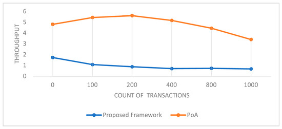 We evaluated the efficiency of the system by determining the number of successful transactions, starting from the first transaction and checking all transactions until the last chained one. We conducted 10 experiments with varying loads and plotted the average efficiencies (Figure 17). Our framework was found to be more efficient than PoA, with the maximum average efficiency recorded at 200 transactions. This value was around 60% higher than the lowest efficiency recorded with 1000 transactions, which was 3.4 transactions per ms. We observed a greater variation in the average efficiency of our framework with varying transaction loads while PoA had already reached its maximum efficiency point. In contrast, our proposed framework demonstrated greater efficiencies before a reduction in efficiency occurred with an increase in the number of transactions.