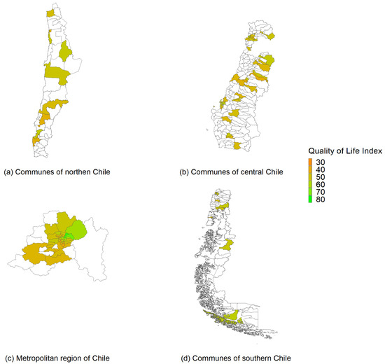 Figure 1 shows the quality of life index for different Chilean regions: Figure 1a shows communes of northern Chile, where the levels of quality of life are approximately 45%; Figure 1b shows communes of central Chile—excluding the Metropolitan Region, which is shown in Figure 1c—where the values of quality of life are approximately 50%, which is slightly better than northern Chile; Figure 1c shows values for the Metropolitan Region and its capital city (Santiago), where this region has the highest amount of communes included in the quality of life index and, moreover, is the only region that includes communes with a quality of life close to 80 points; Figure 1d shows the index for southern Chile, which is similar to central Chile, where the values are approximately 50%, with fewer communes included in the quality of life index.