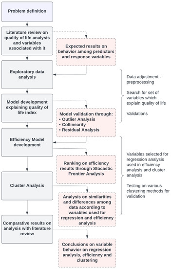 In general, the assessment of quality of life is a subject with no clear consensus. Plenty of research on this topic can be found with different variables and dimensions considered in the analysis. Puertas et al. (2020) [12] developed this index for cities in 23 European countries, taking into account variables such as alcohol consumption, education, happiness, GDP, public investment and environmental investment. Macke et al. (2018) [13] developed and analyzed the interaction in variables related to urban welfare for cities in the south of Brazil, considering variables such as security, efficiency in public services, urban development, environmental factors, green areas, air quality and various economical factors. Somarriba and Zarszosa (2019) [14] studied the quality of life in 28 European countries, looking into the understanding of the interactions among variables, including in their studies variables related to gender, population age, children, salaries, education, child mortality and factors related to relationships in family environments. Although the variables considered seem to be different for each study, some of them are repeated throughout the analysis, where education, job opportunities and environmental conditions appear more frequently and are more considered for researchers while studying this kind of phenomenon.