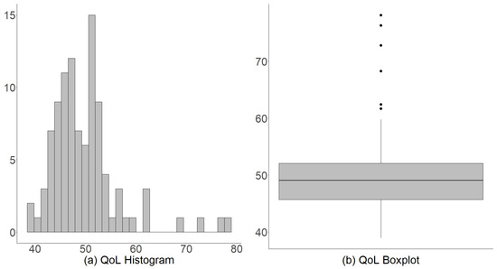 The quality of life index is represented as a value greater than 0, where 0 represents the worst urban welfare. There is no established maximum value for the index, but the higher the value, the better the quality of life. The quality of life (QoL) shows a mean of 50 points and a median of 49 points, with minimum values of approximately 39 points and maximum values close to 80 points. According to histogram (a) in Figure 3, it is possible to appreciate the presence of outliers in the right tail of the curve, which are shown in the boxplot (b) of Figure 3. The distribution of values is concentrated between 40 and 60 points.