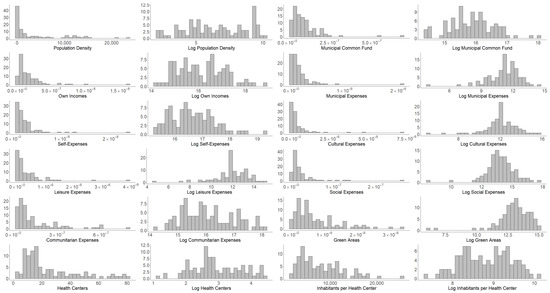 Variables related to municipal expenses and municipal budget were all adjusted through logarithmic transformation. It is possible to appreciate how the variables are centered and show symmetry, as well as similar values in their means and medians, as shown in Table 4 and the histograms in Figure 7.