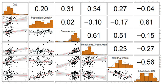 Correlations among quality of life and independent variables shown on Figure 5 are approximately 0.21, where, in all cases except for inhabitants HC (inhabitants per health center), the correlation values are positive. It is worth noting that there are high values in correlations among independent variables, such as cases for green areas with health centers or population density with inhabitants HC.