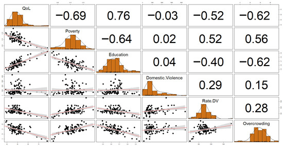 Figure 6 shows correlations among quality of life and sociodemographic variables. In this case, the correlations show higher values compared to those shown in Figure 5: poverty shows a negative correlation of −0.69, education has the highest level of correlation with quality of life among explanatory variables, with a correlation of 0.76, the rate of domestic violence (Rate.DV) shows a negative correlation of −0.52, and overcrowding has similar levels with poverty, with a correlation of −0.62. Some of the independent variables show strong correlations among them, such as the case for poverty and education, with a correlation of −0.64, and poverty and overcrowding, with a correlation of 0.56.