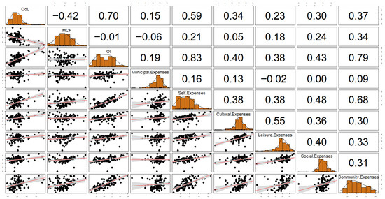The correlation among quality of life and municipal expenses and public budget is shown in Figure 7, where there are some variables that show high levels of correlation with the response variable, own incomes (OIs) show a correlation level of 0.7 with quality of life, which is one of the highest among explanatory variables, self-expenses show the second highest correlation, with a level of 0.59 with quality of life, and the rest of the variables show correlation levels of around 0.30. Some of the explanatory variables show high levels of correlation, with own incomes (OIs) showing a correlation of 0.83 with self-expenses and a correlation of 0.79 with community expenses.