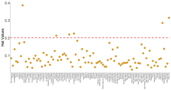 The entire matrix of correlations is shown in Table 5. The values were calculated through the Pearson correlation index due to the distribution and adjustments that the data received during previous steps. It is possible to notice mixed correlations between the independent and response variables, with values of close to 0.7, such as poverty (), own incomes () and education (). It is worth noting that there is a correlation between independent variables because there are some strong parallels with high correlation indexes, such as own incomes and self-management expenses (), own incomes and community expenses () or education and overcrowding (), which suggest that there might be problems with multicollinearity in the model fit stage.