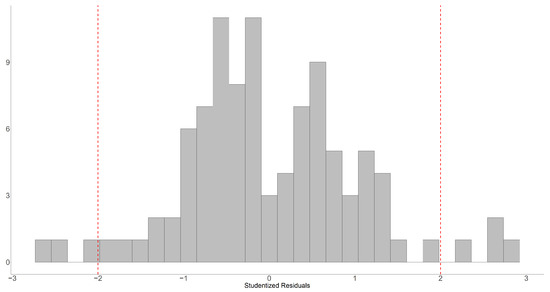 The model chosen from the stepwise selection was the model developed with backward iterations under the AIC criterion. The parameters after fitting the variables into a multivariable regression are shown in Table 7, where all variables are significant under a 5% level of confidence and the errors from the model show some symmetry, with minimum values of approximately −6.5 and maximum values of 6.4. Furthermore, the mean and median of the residuals are approximately −0.32. The results of the parameter estimations show mixed effects on the correlation among the response and independent variables, following the correlations shown in Table 5.