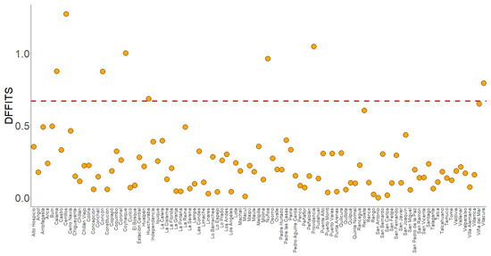 The model identification step was performed through iterative methods, which allow us to test a combination of variables for different models to fit. The selection of this method is due to the number of variables in the analysis. Trying all possible combinations of models with 19 variables returns approximately 260,000 models to test, which is humanly and computationally impossible to carry out. The algorithm to identify the model is stepwise regression with iterations in the form of forward, backward and stepwise (mixture) regression. The results of the iterations process are shown in Table 6. All models are significant according to the Fisher criterion, with p-values for this test of less than 5%, meaning that all models are significant with the existence of at least one significantly different from 0. The coefficients of determination are approximately 85% and, in terms of errors, the mean absolute percentage error (MAPE) is approximately 3.9%, whereas the mean squared error (MSE) is approximately 12%.