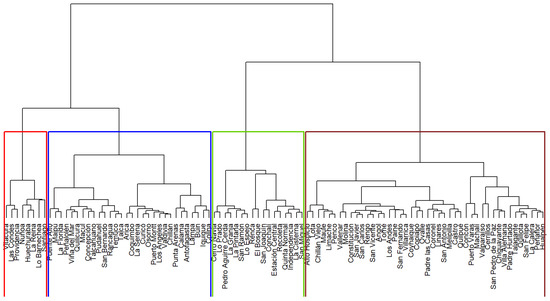 The four groups show part of the differences among regions and municipalities in the study. The fact that cluster 3 has seven municipalities with the highest incomes in the Metropolitan Region and the country shows gaps among the towns clarifies the difference in realities among municipalities placed in the same region with no significant geographical distance. The result of cluster 2 are the opposite to cluster 3. While it shows the wealthiest municipalities, the first one is composed of towns with the worst attributes, such as the lowest levels of education, the highest levels of overcrowding, the lowest amount of green area and the second lowest quality of life index. Cluster 4 is mostly composed of towns far from metropolitan areas, with the lowest levels of the population density and moderate levels of public expenses, whereas cluster 1 works as the opposite of cluster 4, and is mostly composed of big cities that can be considered as regional capitals of their provinces, with mean levels of quality of life, the second highest level of education and the second lowest population density.