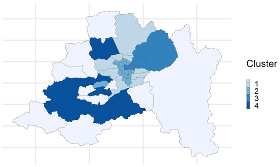 A clustering analysis can be found in various studies that aim to make characterizations of cities, which makes it easier to understand variables associated with urban environments. The characterization method depends on the kind of variable related to the analysis. Studies can be found that suggest grouping in terms of historical features, demographic and human development index characteristics and economic indicators among regions. An analysis developed in cities and regions from the UK suggests three groups using the k-means algorithm, the first one being historic and university cities, the second being industrial cities and the third being larger cities [75]. Another research developed a cluster analysis through k-means in regions from Indonesia, suggesting three groups in terms of human development indexes (HDIs), making the clusters from the highest to lowest HDI [76]. An analysis of regions from Latvia developed a k-means clustering algorithm, suggesting four groups with significant differences in economic and social indexes. The results characterize the first group as the one with the lowest level of unemployment and highest level of entrepreneurship, the second group as having the largest share of people at working age and highest unemployment rate, and the other two clusters as a mixture of the first and second one [77]. In all cases, the results are suggestions and mechanisms for supporting decision making on social project development and understanding regions and cities regarding their various characteristics.