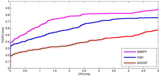In this section, we perform some numerical experiments to validate the SMDFP algorithm by comparing the computed results with the conjugate gradient hybrid (CGH) method [61] and with the generalized hybrid CGPM–based (GHCGP) method [62]. All algorithms are written in Matlab R2014 on an HP CORE i5 Intel 8th Gen personal computer. In our experiment with the uniform stopping condition, we used the published initial values for the comparison algorithms. However, we used and in the SMDFP algorithm. The numerical simulations are stopped either exceeding the dimension or . For the following problems see [63,64,65,66,67,68].