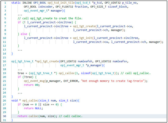 CVE-2019-6988 is a public CVE, and this vulnerability occurs in the opj_calloc function. This vulnerability is formed because the program code lacks the detection of the allocated amount and the security mechanism for specially crafted files. In Figure 1, the code snippet related to an uncontrolled memory allocation vulnerability (CVE-2019-6988) exists in the executable program OpenJPEG version 2.3.0. In the source code project, the function opj_tcd_init_tile in file tcd.c is called when the OpenJPEG is running to decompress the “specially-crafted” images. This vulnerability allows a remote attacker to attempt too much memory allocation by function opj_calloc in the file opj_malloc.c, which calls the system function calloc to allocate a large amount of heap memory and ultimately results in a denial-of-service attack due to a lack of enough free heap memory.