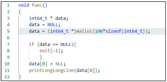 As shown in Figure 2, the code snippet concerning memory leaks vulnerability exists in a program case of Samate Juliet Test Suite. This case is a memory leak vulnerability caused by allocating heap memory without release. Specifically, the case uses the function malloc on line 5 to allocate memory and checks whether the allocation is successful or not on line 7. However, at the end of the function, the allocated memory data is not effectively released, eventually resulting in a heap memory leak.