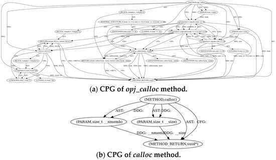 The program files can be parsed using the source code analysis tool Joern to obtain the CPG. In order to show what useful data can be obtained from CPG for data relationship derivation, we analyze OpenJPEG v2.3.0 containing CVE-2019-6988 introduced in Section 3.1. Due to the huge number of codes, we only show the partial CPG shown in Figure 3. Figure 3a is the full CPG of the opj_calloc function, in which the calloc method is the partial zoom shown as Figure 3b. From Figure 3b, we can find the calloc method is dependent on the parament t_nmemb and t_size. We also find the parament t_nmemb and t_size are dependent on the return method. Combined with CFG, we can derive the potential dependent relationship between the calloc function and the calloc function and the return function.