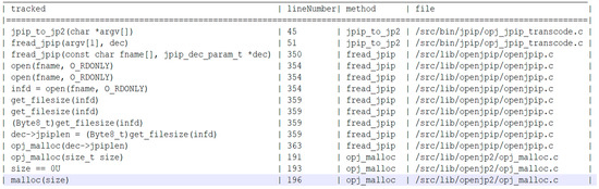 Figure 4 shows the partial data flow of the heap memory allocation function obtained through static taint analysis in OpenJPEG v2.3.0, which is a data flow path to the parameter value of the standard library function malloc. Each path contains four aspects of information. Among them, the tracked column contains the statements in the queried nodes, the lineNumber column contains the line number in the source code file, the method column displays the method names where the statements are located, and the file column displays the locations of the source code file. To construct the source set, we mark the parameters of all methods and call all functions in the CPG into the source set. We find all call-sites for all methods in the graph with the name malloc and mark their arguments into the sink set. After identification, we obtain a data flow path to malloc in our query of OpenJPEG’s CPG. Eventually, we collect dataflow-related functions jpip_to_jp2, fread_jpip, and opj_malloc, which were obtained in the dataflow path after the static taint analysis.