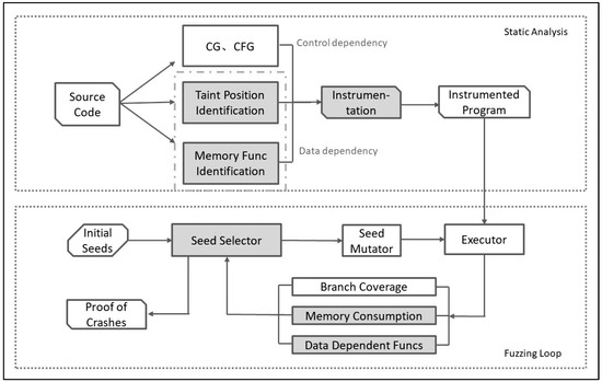 SemFuzz [36] tracked kernel function parameters on which key variables depend through reverse data flow analysis. SeededFuzz [37] proposed a dynamic taint analysis (DTA) approach to identify seed bytes that influence the values of security-sensitive program sites. TIFF [38] proposed a mutation strategy to infer input types through in-memory data structure identification and DTA, which increased the probability of triggering memory corruption vulnerabilities. However, data flow analysis, especially DTA, often increases runtime overhead and slows down the program while obtaining accurate data information of PUT. Fairfuzz [39] and Profuzzer [40] all adopted lightweight taint analysis to find the guiding mutation solution and obtain the variable taint attributes. GREYONE [41] equipped fuzzing with lightweight Fuzzing-Based Taint Inference (FTI) to carry out taint calibration for the branch jump variables of the program control flow. In the process of fuzzing, they mutate the specific bytes of samples and observe the changes of tainted variables to obtain the data dependency relationship between seed bytes and tainted variables.