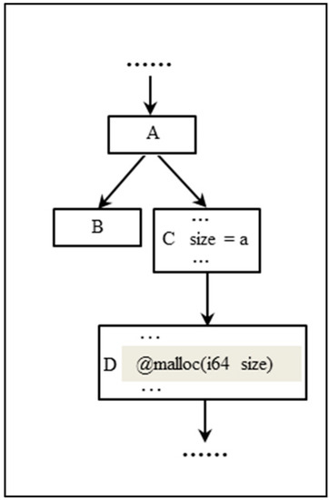 As shown in Figure 6 below, there are four basic blocks A, B, C and D representing nodes in the CFG of the program. The program will first go to B or C according to a branch condition. Once the branch condition for block C is met, the variable size is initialized, and then the memory allocation operation is performed in the block D. We traverse branches of the basic block described by IR language from the beginning of the program. Once we find a match among all our target heap functions, we locate the potential block D and instrument it.