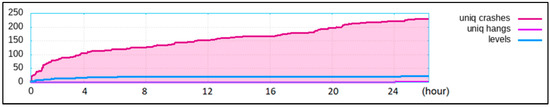 Figure 7 below is an experimental record of fuzzing readelf; the ordinate shows the number, and the abscissa shows the time. We mainly focus on the changes in the number of unique crashes. It shows that the growth rate is the fastest in the first 2 h, and the growth rate slows down after about 22 h, which fully meets the definition of a “relatively stable state”. The other tests also meet the definition of a “relatively stable state” around 24 h. We consulted a large number of vulnerability discovery studies and methods, and many studies also selected 24 h as the test standard. In addition, MemConFuzz, Memlock, and PerfFuzz are all improved based on AFL, so if the time is too long, when almost no heap consumption vulnerabilities can be found in the end, it will gradually degenerate into AFL’s general vulnerability discovering, and the discovery efficiency for heap consumption vulnerability cannot be demonstrated at this time. In order to comprehensively ensure accuracy and efficiency, we uniformly select 24 h as our test standard, which can reflect the ability of vulnerability discovering and also reduce unnecessary time overhead.