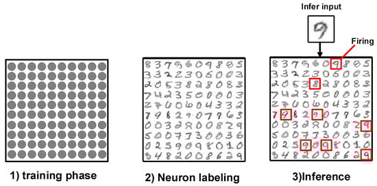 For presenting the digits from the MNIST dataset to the network for training, the input pixels are converted to a Poisson-distributed spike train with a rate proportional to the pixel intensity. The excitatory and inhibitory layers include the same number of neurons. A one-to-one neural connection is established between the excitatory and inhibitory layers [11]. Alternately, a neural connection is ensured between each neuron in the inhibitory layer and all neurons in the excitatory layer except for those connected through the excitatory layer. This network connectivity offers a winner-take-all (WTA) mechanism by implementing lateral inhibitions that compete in the excitatory layer [9,12]. Figure 2 shows that the network includes three phases: the training phase, neuron labeling phase, and inference phase. (1) Training phase: Neurons insert spike trains as input and learn data using the STDP learning rule described previously. (2) Neuron labeling phase: This phase assigns the label to each neuron based on the highest response for label classes. The spike counts generated at this phase are called neuron labeling spike counts. (3) Inference phase: This phase measures the classification accuracy of the network. The sum of the classes assigned in the neuron labeling phase of firing neurons becomes the final inference. This is the only step where labels are used. This hardware-friendly, energy-efficient, parallel processing SNN architecture can be implemented as a neuromorphic processor; however, it possesses the disadvantage of low accuracy [9]. The lack of accuracy in these neuromorphic circuits is challenging. Therefore, in this paper, we propose a method to achieve enhanced accuracy while maintaining the aforementioned advantages of the neuromorphic process.
