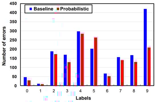 Figure 5 presents an improved error in the proposed method, demonstrating its effectiveness in reducing errors for most patterns. Notably, it exhibits a considerable improvement for label 9, which had the highest error rate in the conventional method. However, we observed performance degradation for label 5, which is distinct from the other digits in the dataset in terms of its shape and orientation. This may suggest that the proposed method is less suitable for certain patterns that deviate significantly from the characteristics of the training data. Furthermore, the proposed method has certain limitations and assumptions that may affect its performance on certain patterns, such as the use of unsupervised STDP learning and the assumption of independent probabilities for each label. Future research could explore methods to overcome these limitations and improve the overall performance of the proposed method.