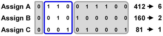 Figure 6 shows an example of 3-bit range neuron labeling. When three different labels are assigned, “A” spike counts are reduced from 412 to 6, “B” spike counts are reduced from 160 to 2, and “C” spike counts are reduced from 81 to 1. There is a large deviation in the assigned spike count for each neuron. This approximation technique minimizes the deviation of set spike counts through normalizing all neurons to uniform range spike counts. Spike counts that are sufficiently small for exclusion from consideration are ignored as zeros in this process.