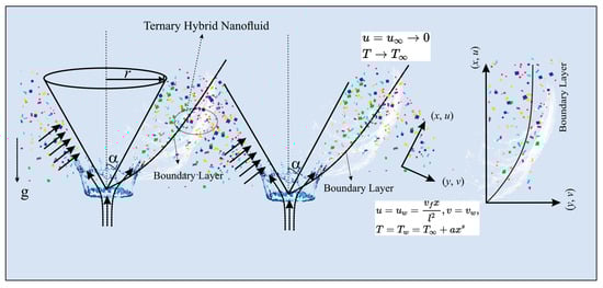 The flow of THNF (Al2O3-Cu-CNT/water) toward three different geometries (a cone, a wedge, and a flat plate) is characterized by the following conditions [32,35]:
