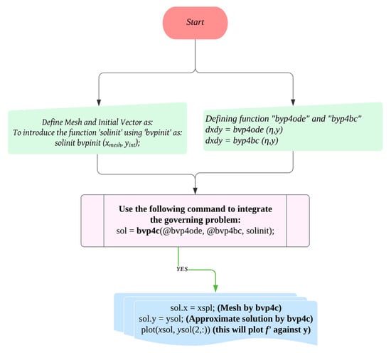 In addition, the values of slopes not known are guessed to begin the process of solving the equations. The iteration process is repeated, and the solution is acknowledged only when BCs are met (see Figure 2). In this model, ηmax was taken as 6, as the conditions at this point were satisfied asymptotically, and step size was taken as 0.01. To authenticate the results of the present model, a comparison is outlined with the published results of Vajravelu and Nayfeh [38] (see Table 3). The results are reasonably consistent, confirming that the present conclusions are effective.